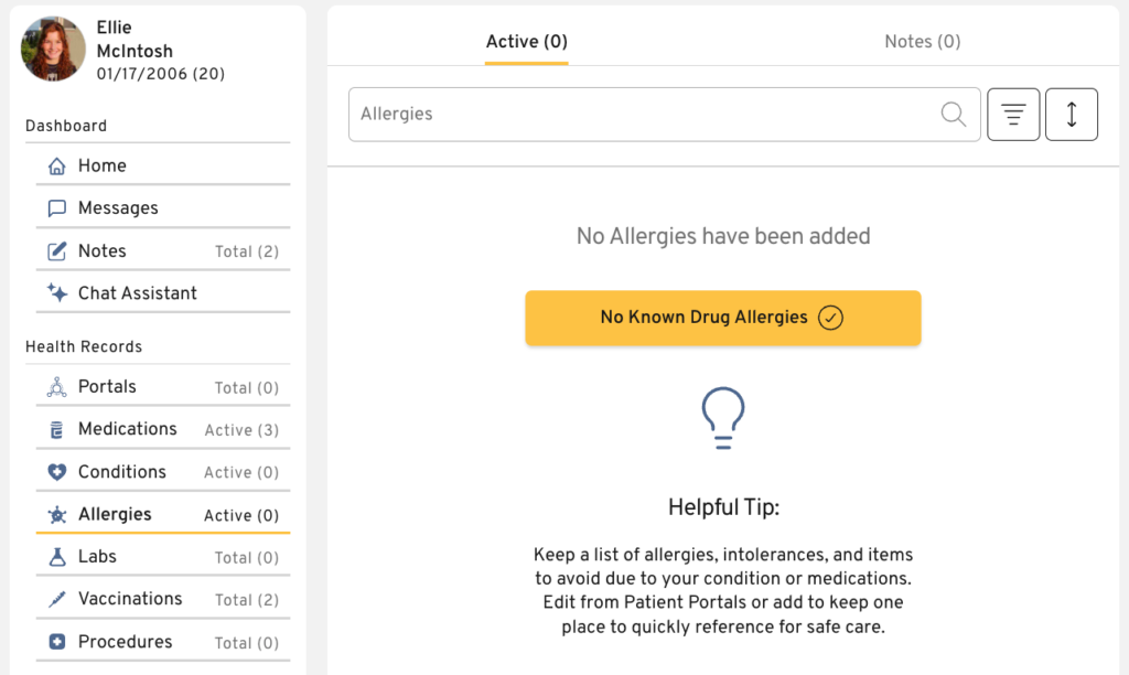 Not having an allergy listed in a profile is not the same as stating that a person has No Known Allergies. Users can now quickly click a button to set this value for the profile. This status can be changed simply by adding an allergy should one be identified.